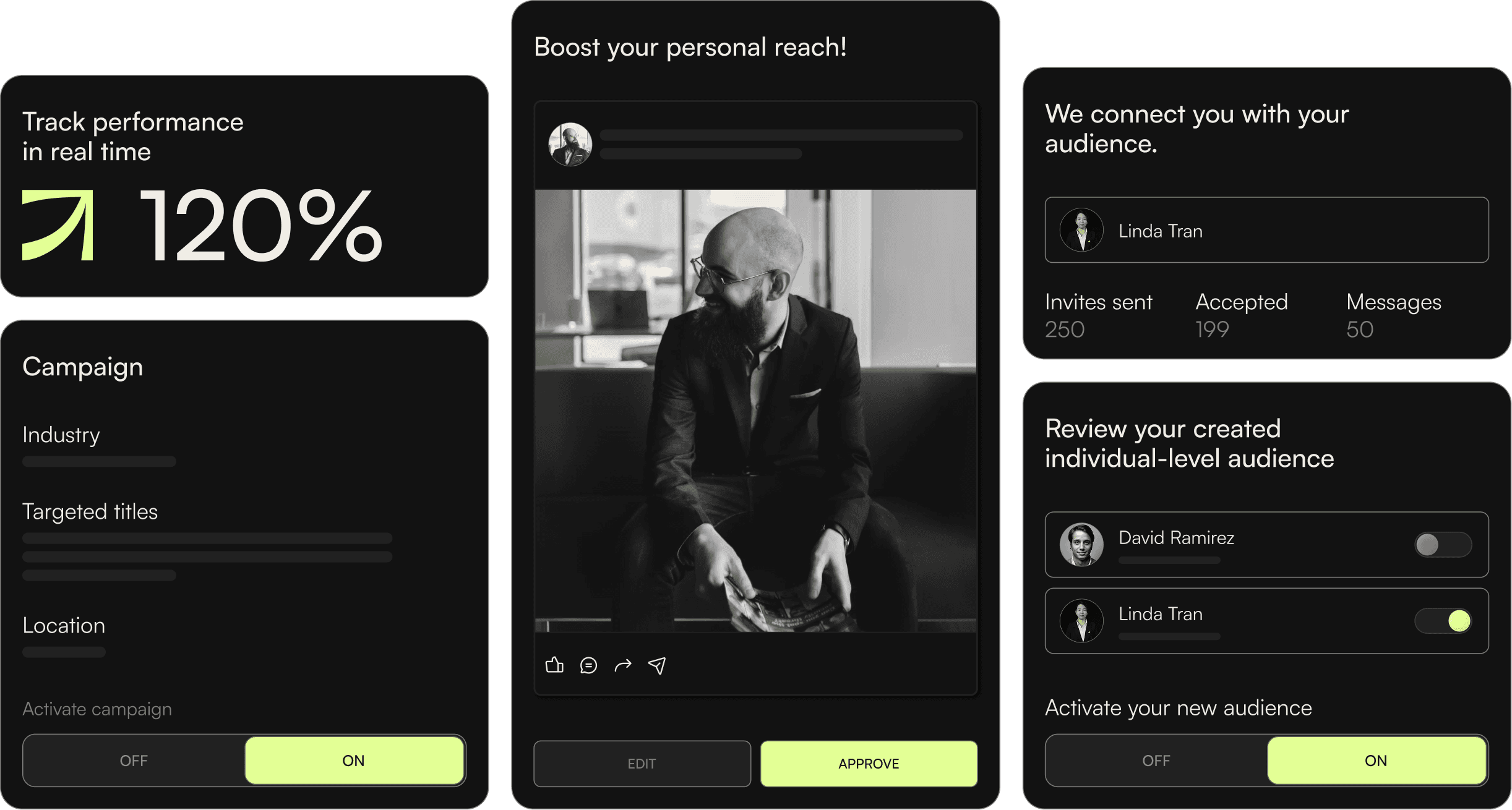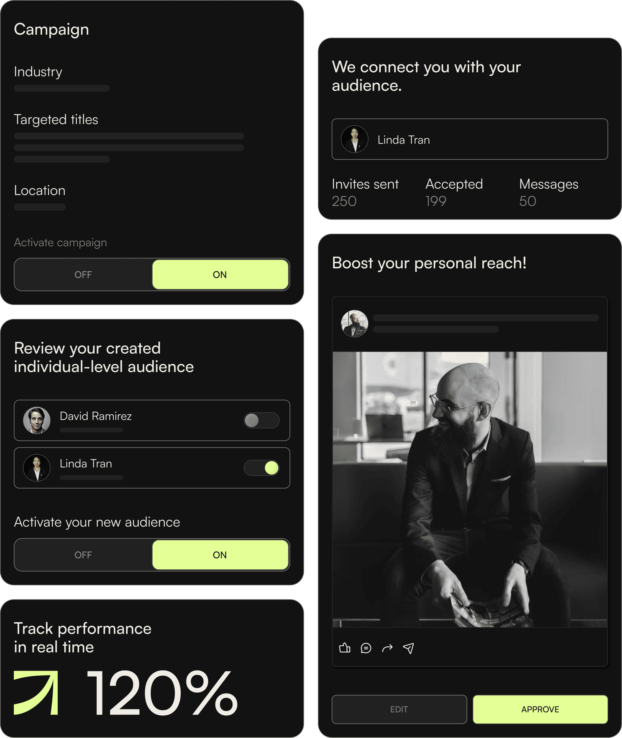 Your entire commercial engine in one place. Build your ICP, control your audiences, approve ads and outreach, and track account-level performance across marketing and sales, all inside one intuitive platform.